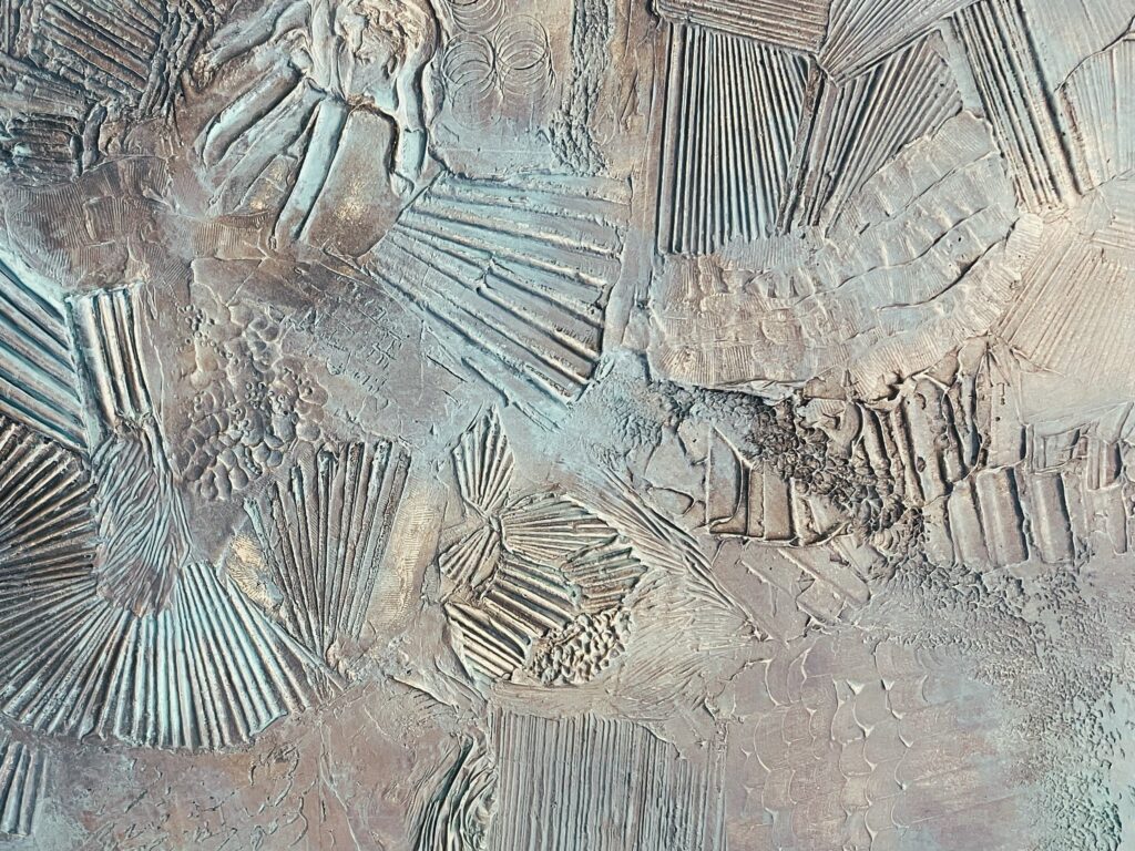 bas relief en papier mâché réversible, enduit, colle a papier peint et patine aux pigments [2025]