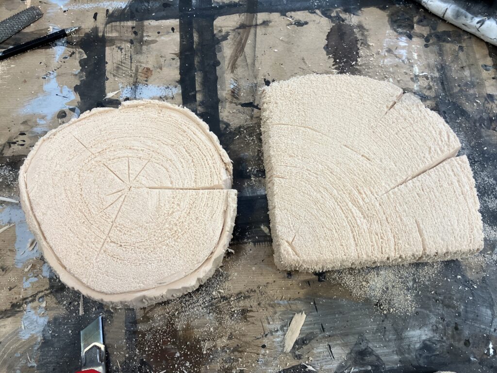 sculpture peinture et patine sur polystyrène, fausse souche en découpe [2025]