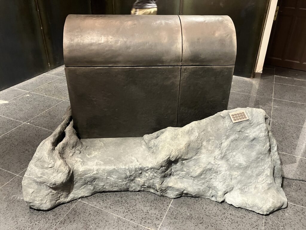 peinture et patine métal sur coffre ossature bois + sculpture et peinture faux rocher plâtre et filasse [2025]