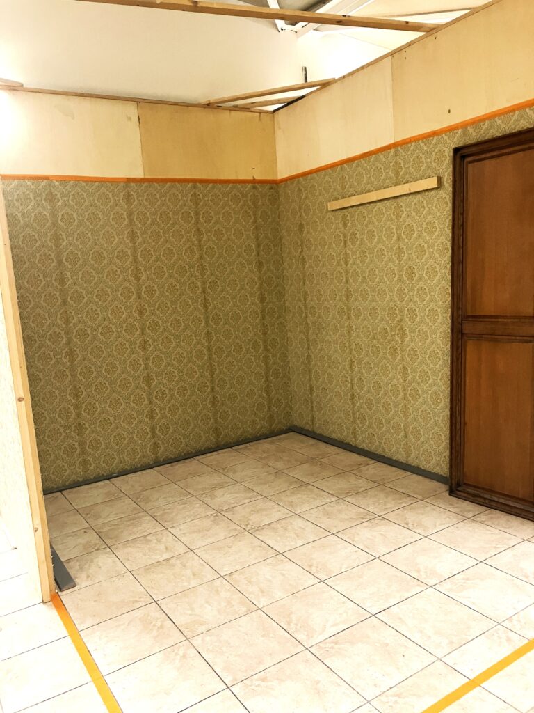 salon année 1980, papier peint sur feuilles à décor, peinture réversible colle à papier peint et pigments carrelage au sol [2025]
